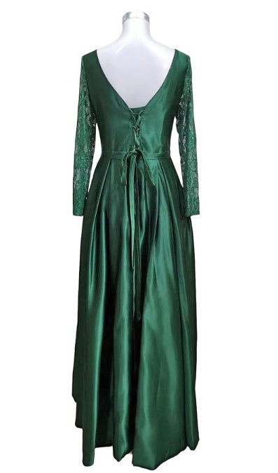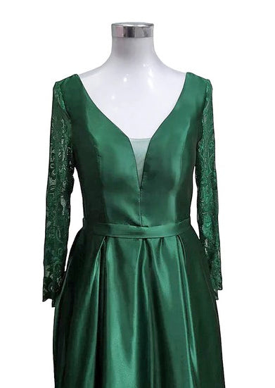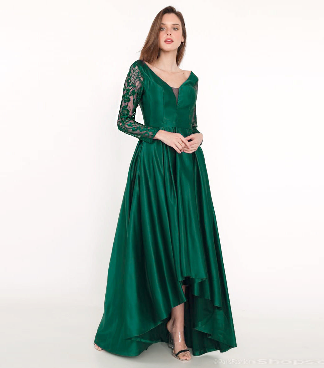 Abito stile cerimonia corto davanti lungo dietro con maniche lunghe in pizzo. Materiale satinato fluido dal taglio svasato. L'abito è foderato e ha tasche su ciascun lato. Chiusura posteriore con mezze allacciature e cerniera. la modella è alta 175 cm e indossa una taglia M